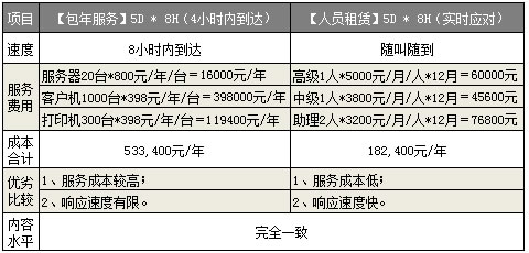 "C企业是一家综合集团公司,采取5天工作制,各个分公司集中在C大楼办公。共有900套台式电脑,100台笔记本电脑,300台打印机,20台PC服务器,以及防火墙、路由器、多层交换机等。基于windows2016/UNIX/LINUX搭建的局域网,应用了ERP/CRM/HR/财务等各种行业软件,"基础IT服务内容"涉及到电脑软硬件维护、邮件接收、共享上网、病毒防治、内外网安全、IT资产管理等各个技术细节,并对服务速度有着严格的要求,所有的服务到达时间均控制在1小时以内。 考虑该客户的电脑数量较多,下面,我们对比一下C客户选择旺希的【包年服务】模式中的"5D * 8H"+"4小时内到达"的服务标准和【人员租赁】模式中的 "5D * 8H" 的服务标准的优劣对比(时间均为1年)."