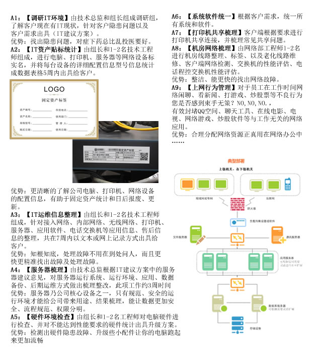 我们在网络、服务器、业务系统、程控电话、外设等均有专项小组提供服务,拥有5人以内的IT部门所无法比拟的专业优势。